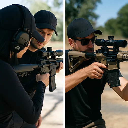 Aprendes a sujetar, apuntar y operar correctamente un rifle, con énfasis en seguridad, postura estable y control básico del retroceso.